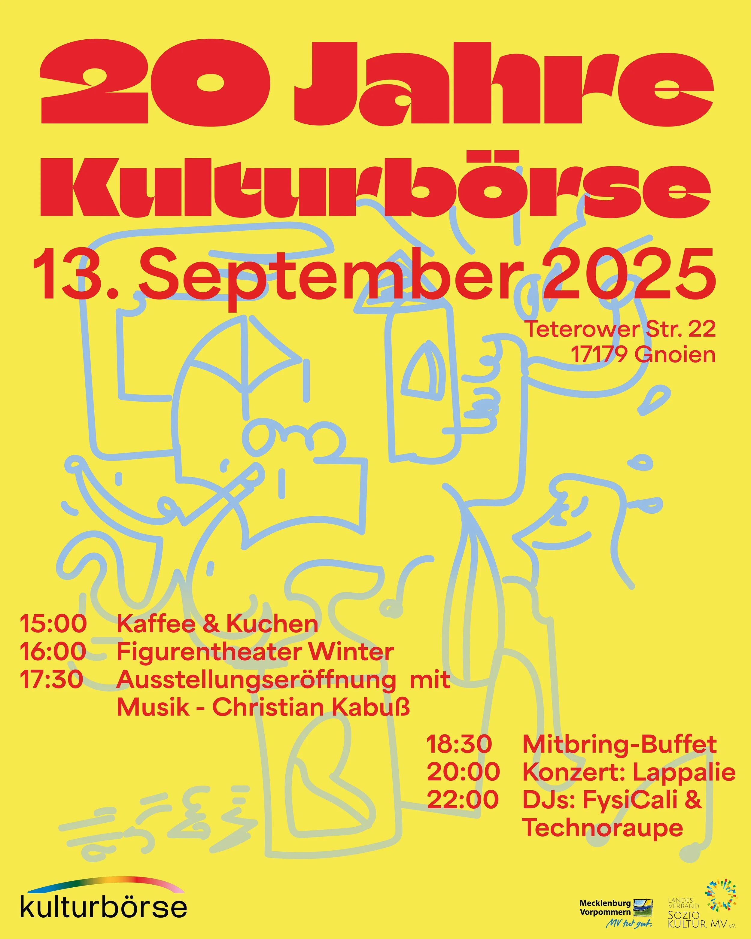 Am 13.9. ist unser jährliches Hoffest! Dieses Jahr mit einem Jubiläum - wir feiern 20 Jahre Kulturbörse. Kommt vorbei für Kaffee, Kuchen, ein Stück vom Figurentheater Winter, Ausstellung mit Christian Kabuß, Konzert von Lappalie und Musik von FysiCali und Technoraupe. Nicht zu vergessen unser Mitbring-Buffet!